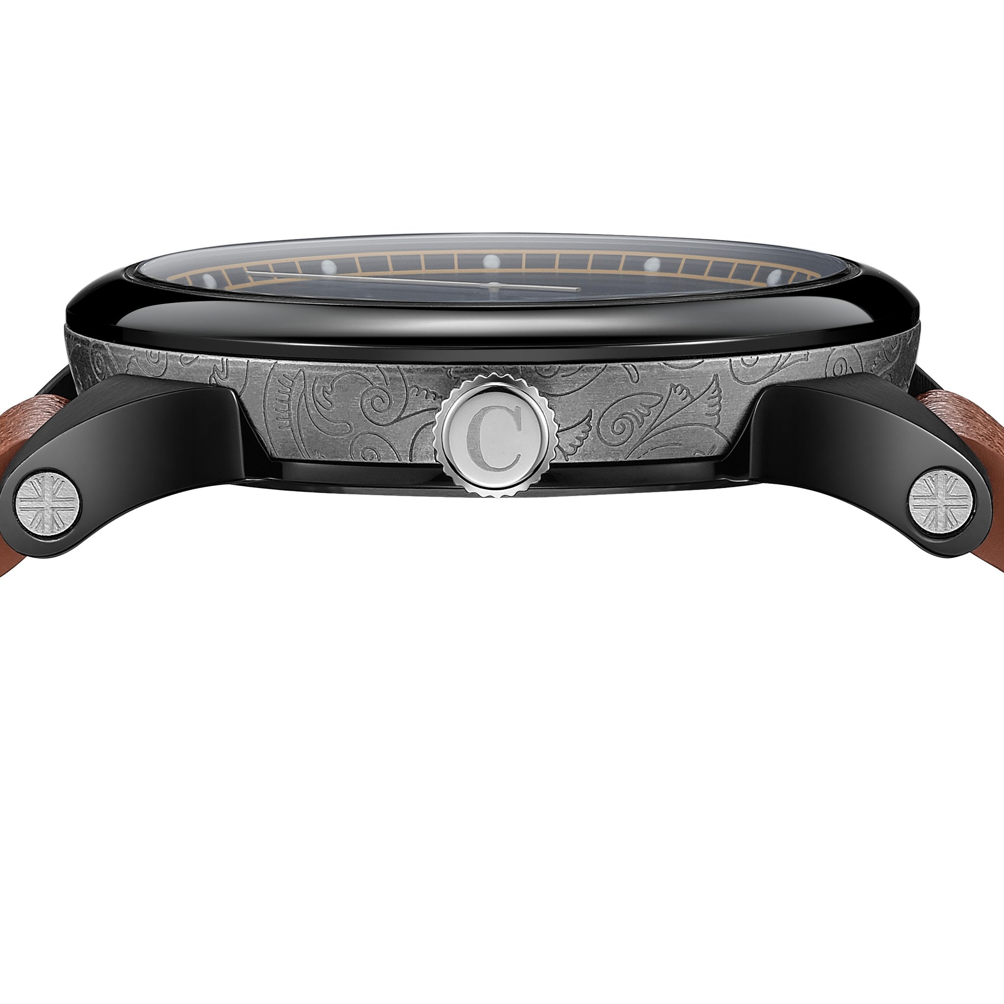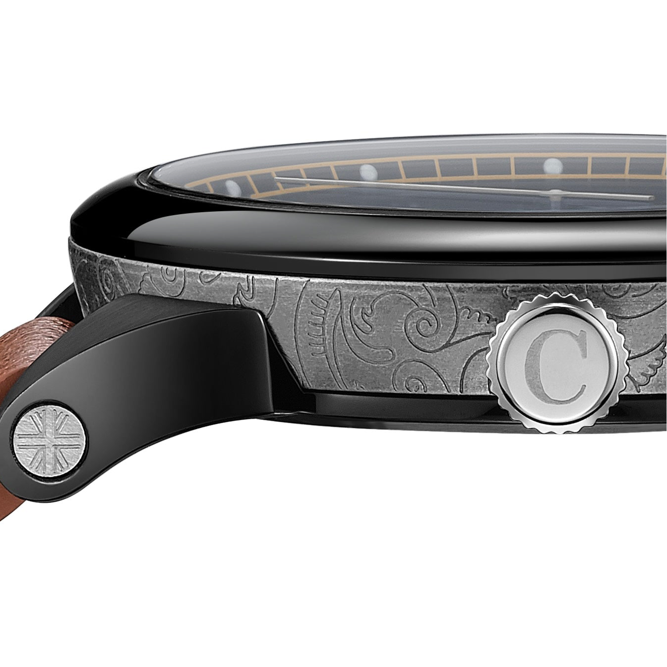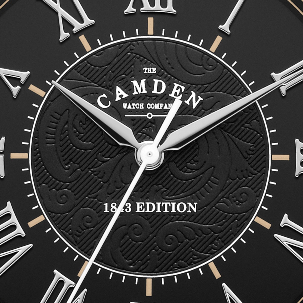 The watch itself draws from the colour and character of duelling pistols, with both the case and dial carrying an intricate paisley motif inspired by the elegant engravings found on historic pistols — a subtle nod to a dramatic chapter of Camden’s past.