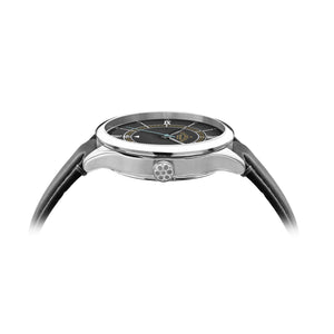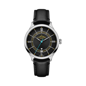 • STEEL CASE WITH BLACK DIAL AND BLACK LEATHER STRAP.