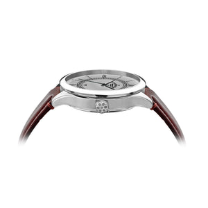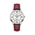 STEEL CASE WITH WHITE DIAL AND OXBLOOD LEATHER STRAP.