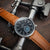 STEEL CASE WITH BLACK DIAL AND TAN LEATHER STRAP.