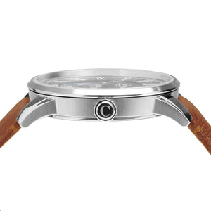 STEEL CASE WITH SILVER DIAL, BLACK ACCENTS AND BROWN LEATHER STRAP.
