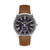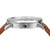 STEEL CASE WITH SILVER DIAL, BLACK ACCENTS AND TAN LEATHER STRAP.