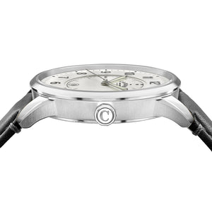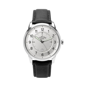 STEEL CASE WITH SILVER DIAL, BLACK ACCENTS AND BLACK LEATHER STRAP.