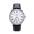 STEEL CASE WITH WHITE DIAL AND BLACK LEATHER STRAP.