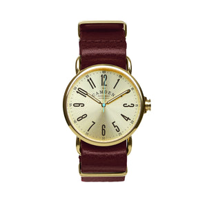 GOLD CASE WITH GOLD DIAL AND OXBLOOD LEATHER STRAP.