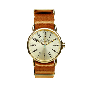 This is a smaller version of our classic and bestselling No.88. The lugs of the No.88 are based on those found classic vintage watches, in contrast to the modern case shape. The dial and crown are reminiscent of steam train gauges. The hand is the same turquoise-blue as the iconic Camden Lock bridge.