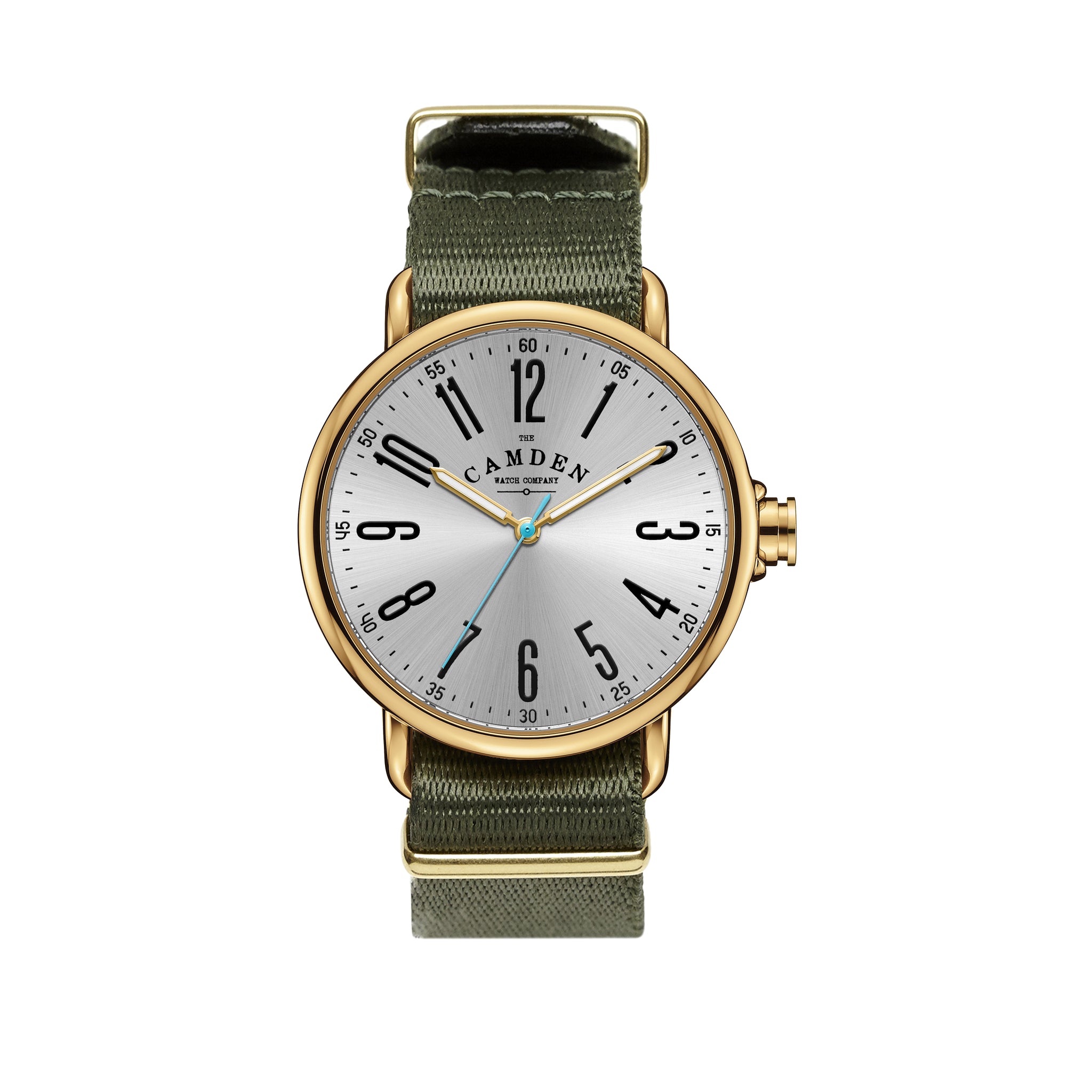 GOLD CASE WITH SILVER DIAL AND CAMEL NATO STRAP.