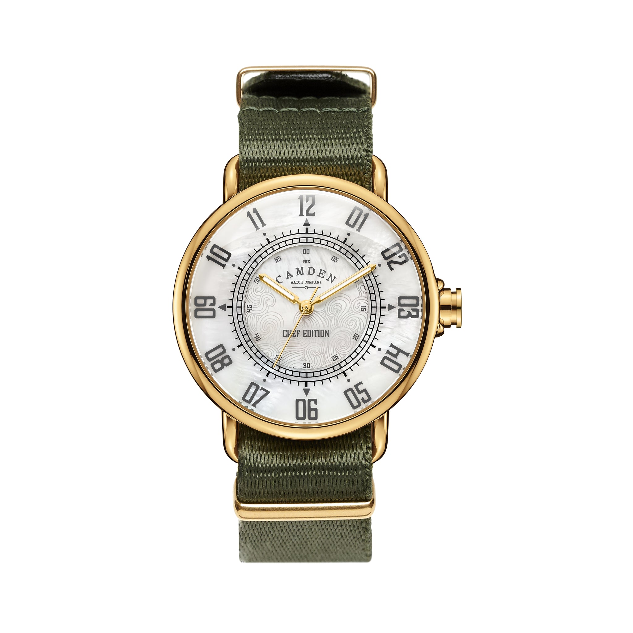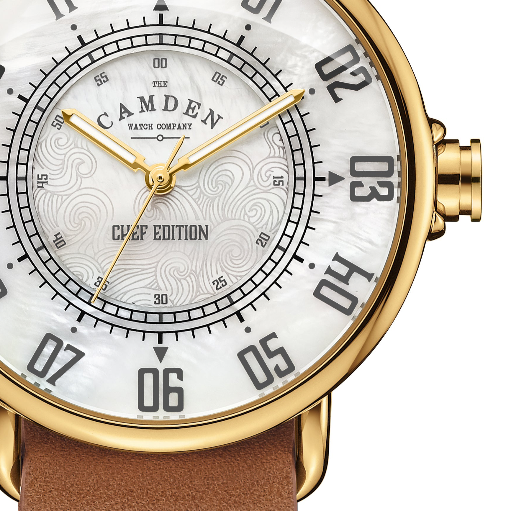 Using our No.88 unisex case, we have designed a watch that transitions seamlessly from chef’s whites to casual wear. The mother-of-pearl dial, inspired by oyster shells, features large, quick-to-read numbers and a subtle wave pattern, reflecting Tom’s love of the sea. The markings take cues from vintage kitchen tools, while the gold case and tan strap evoke the warm tones of copper cookware, combining practicality with culinary-inspired style.