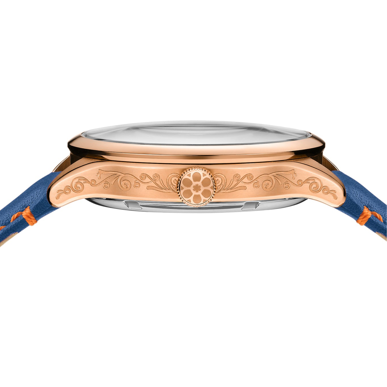 ROSE GOLD CASE WITH BLUE DIAL AND BLUE LEATHER STRAP.