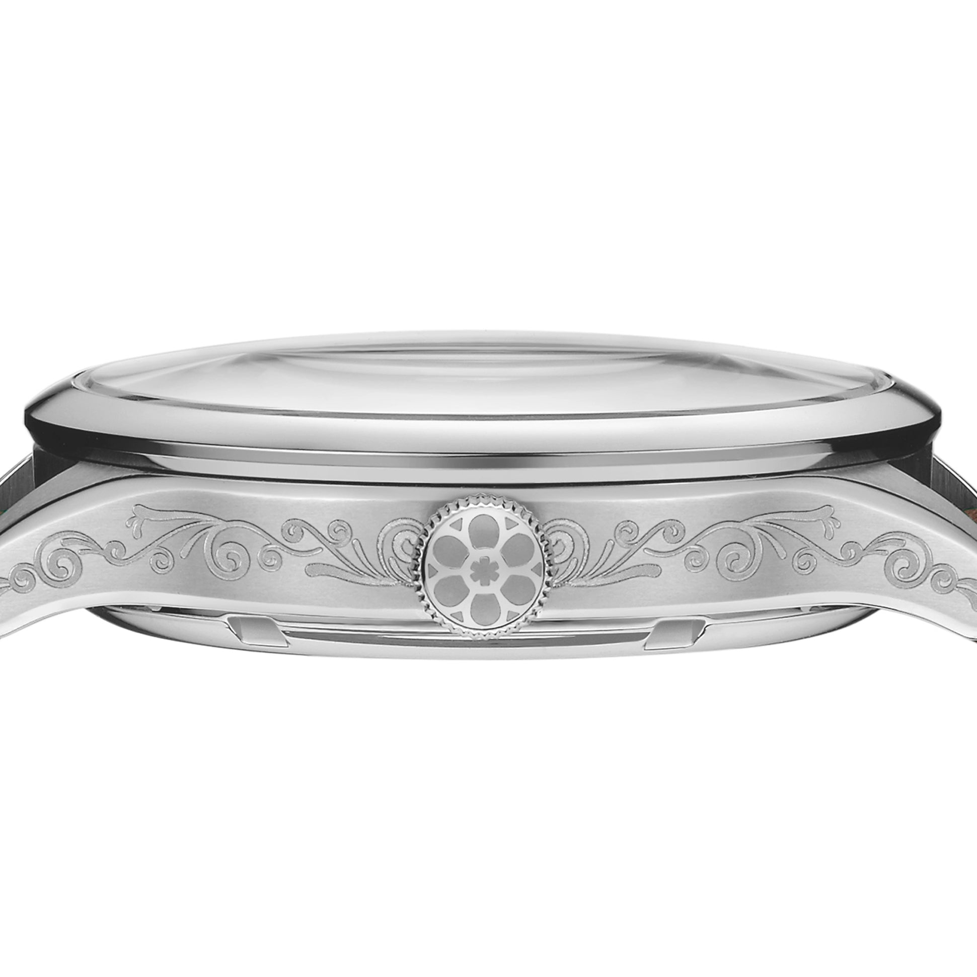The No.29 Automatic watch face is inspired by traction engines, a Victorian invention that revolutionised manual labour. The numbers and surrounding frame are inspired by the front plate found on these engines, and the machined pattern in the centre of the dial is inspired by the detailing found on Victorian steam engines in general.