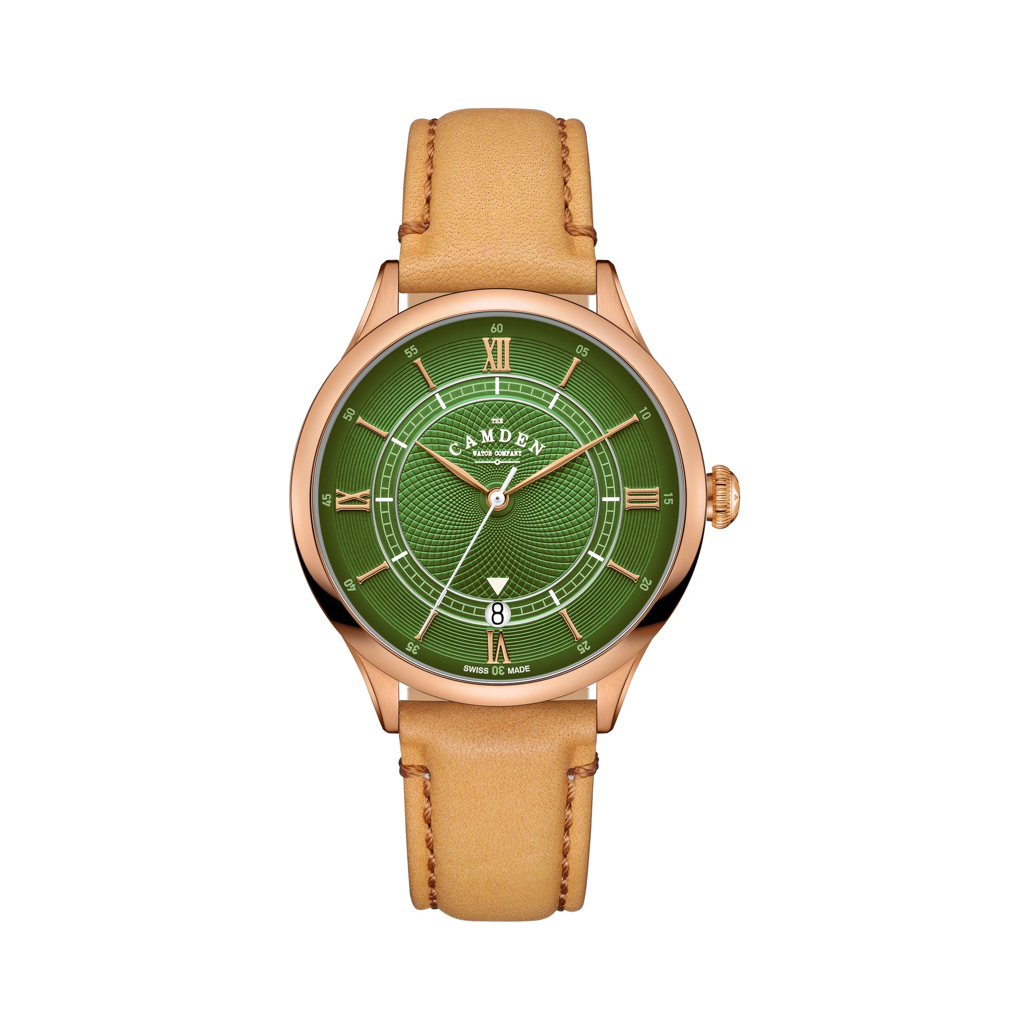 ROSE GOLD CASE WITH GREEN DIAL AND TAN LEATHER STRAP.