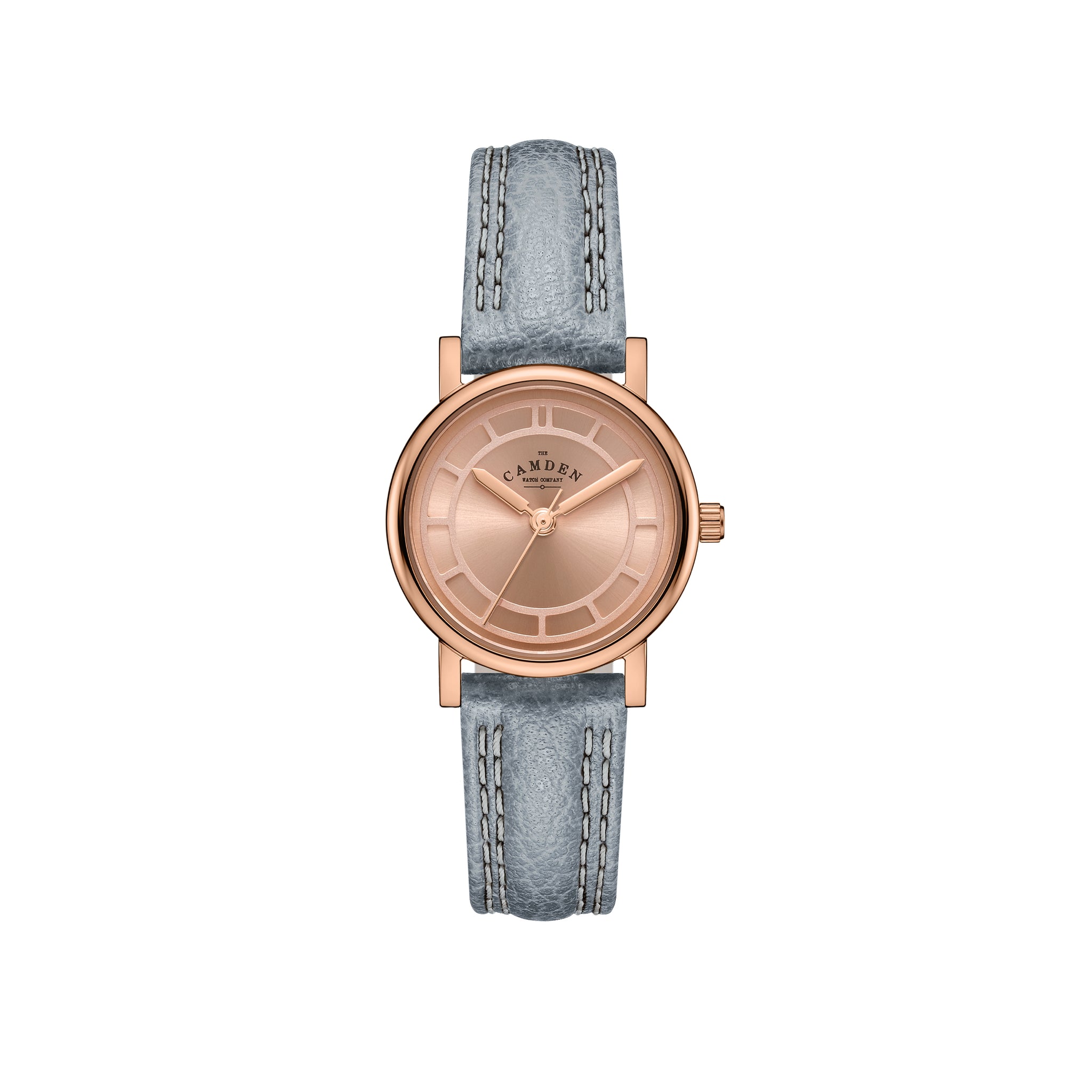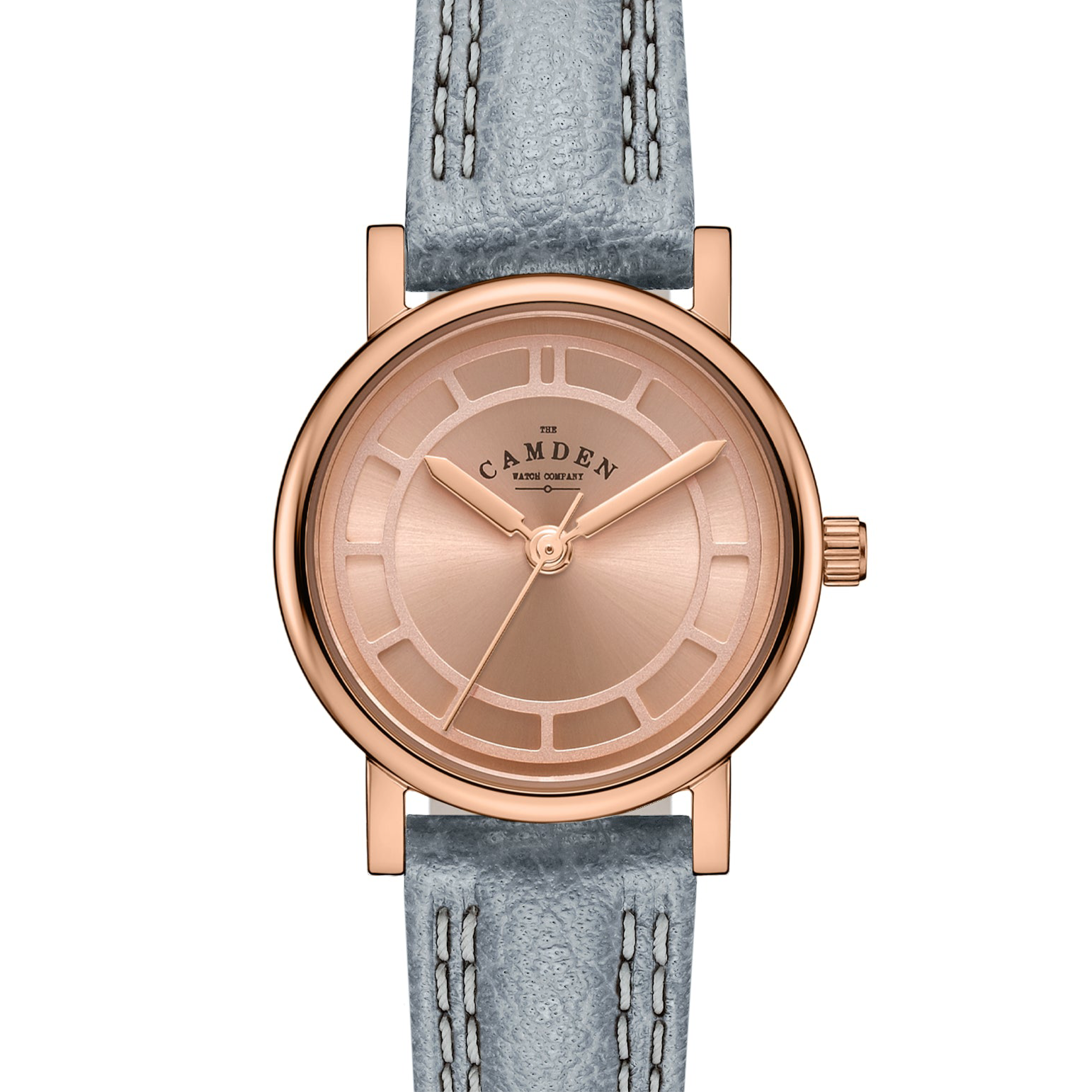 ROSE CASE WITH ROSE GOLD DIAL AND GREY LEATHER STRAP.