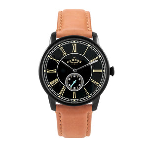 • BLACK CASE WITH BLACK DIAL AND TAN LEATHER STRAP.