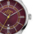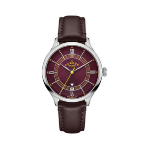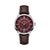 • STEEL CASE WITH OXBLOOD DIAL AND BROWN LEATHER STRAP.