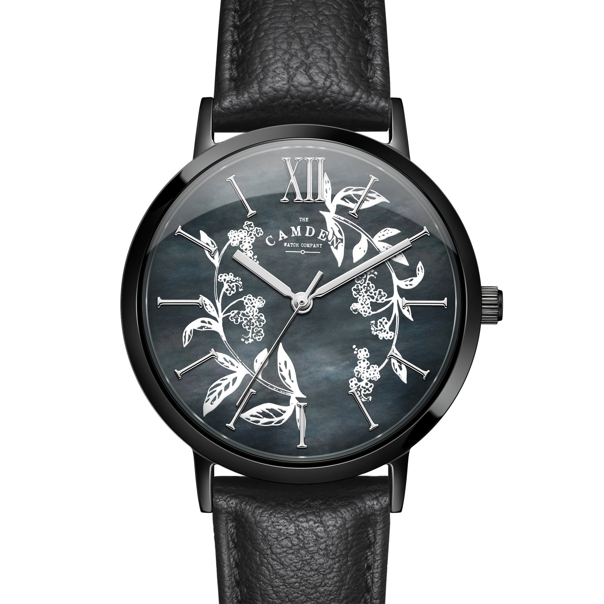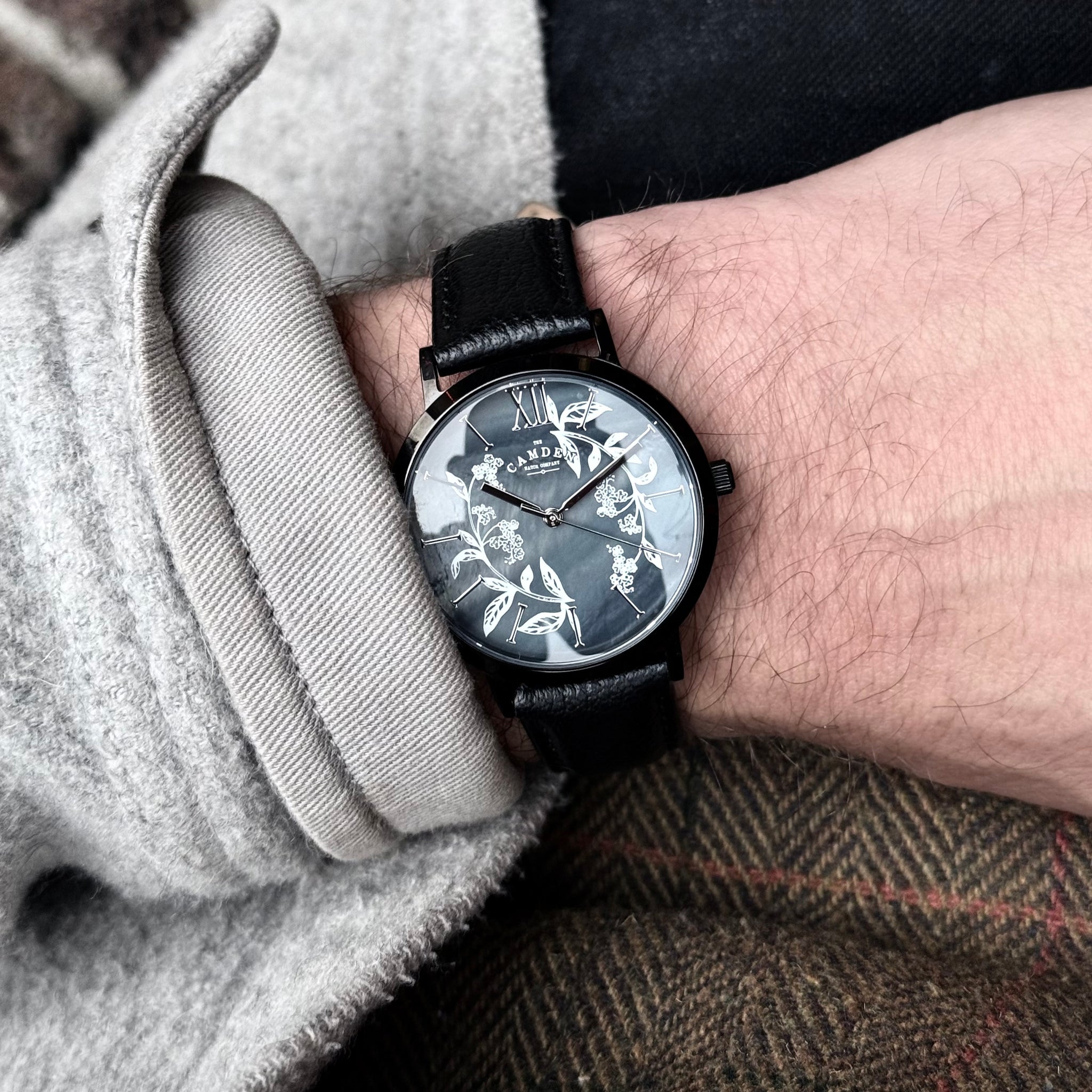 A No.27 Camden Watch designed in collaboration with tattoo artist Rebecca Vincent. Inspired by the Victorian Language of Flowers, Rebecca has brought her signature style to the white Mother of Pearl dial, making this monochrome watch a beautiful and striking addition to any wrist.