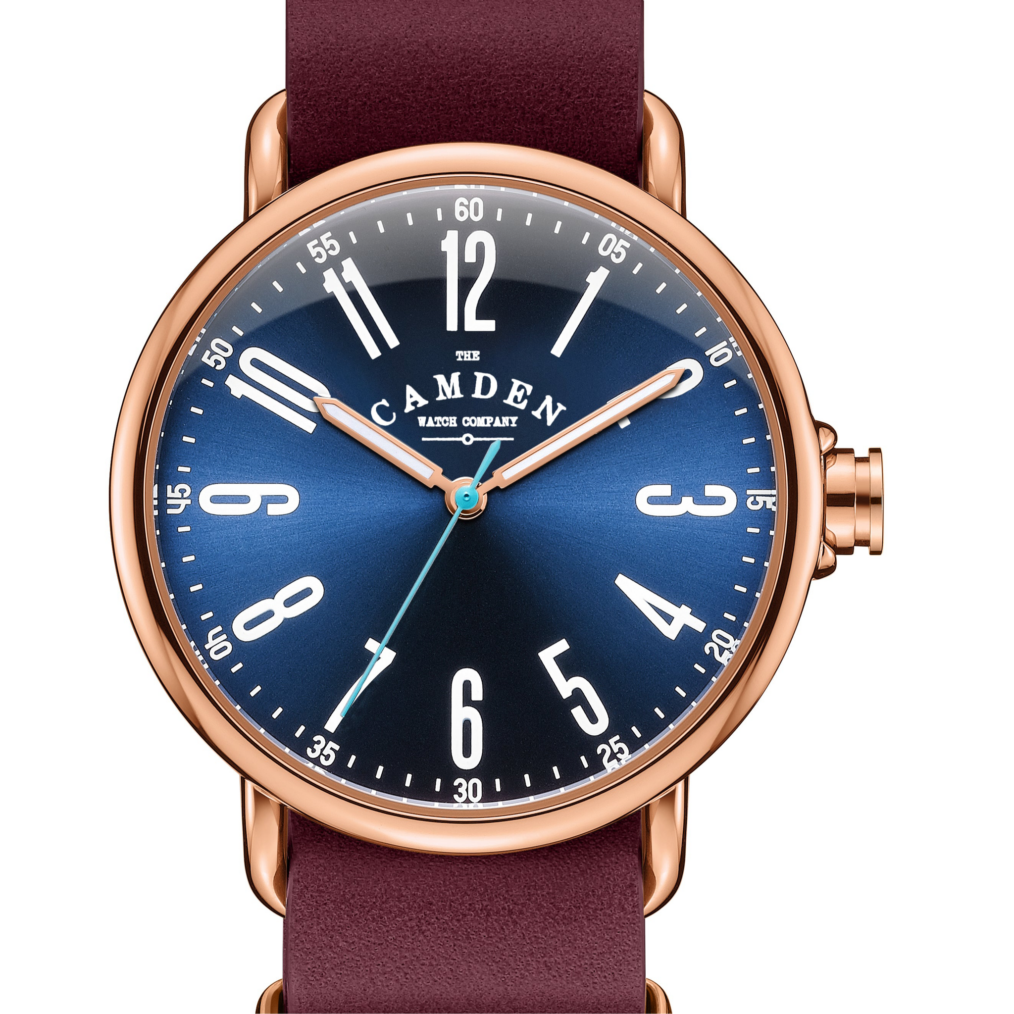 ROSE GOLD CASE WITH NAVY BLUE DIAL AND OXBLOOD LEATHER STRAP.