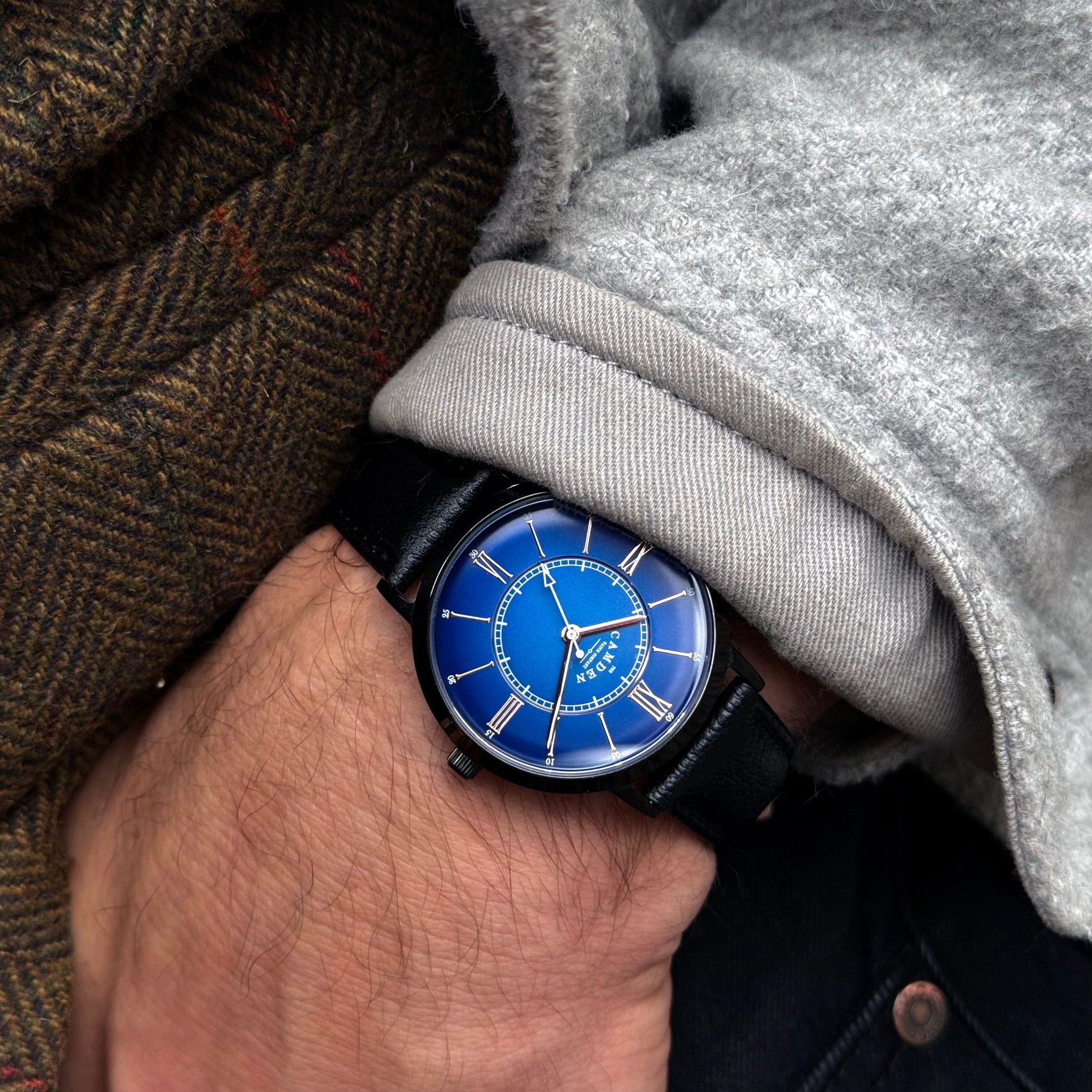 BLACK CASE WITH BLUE GRADIENT DIAL, ROSE GOLD ACCENTS AND BLACK LEATHER STRAP.