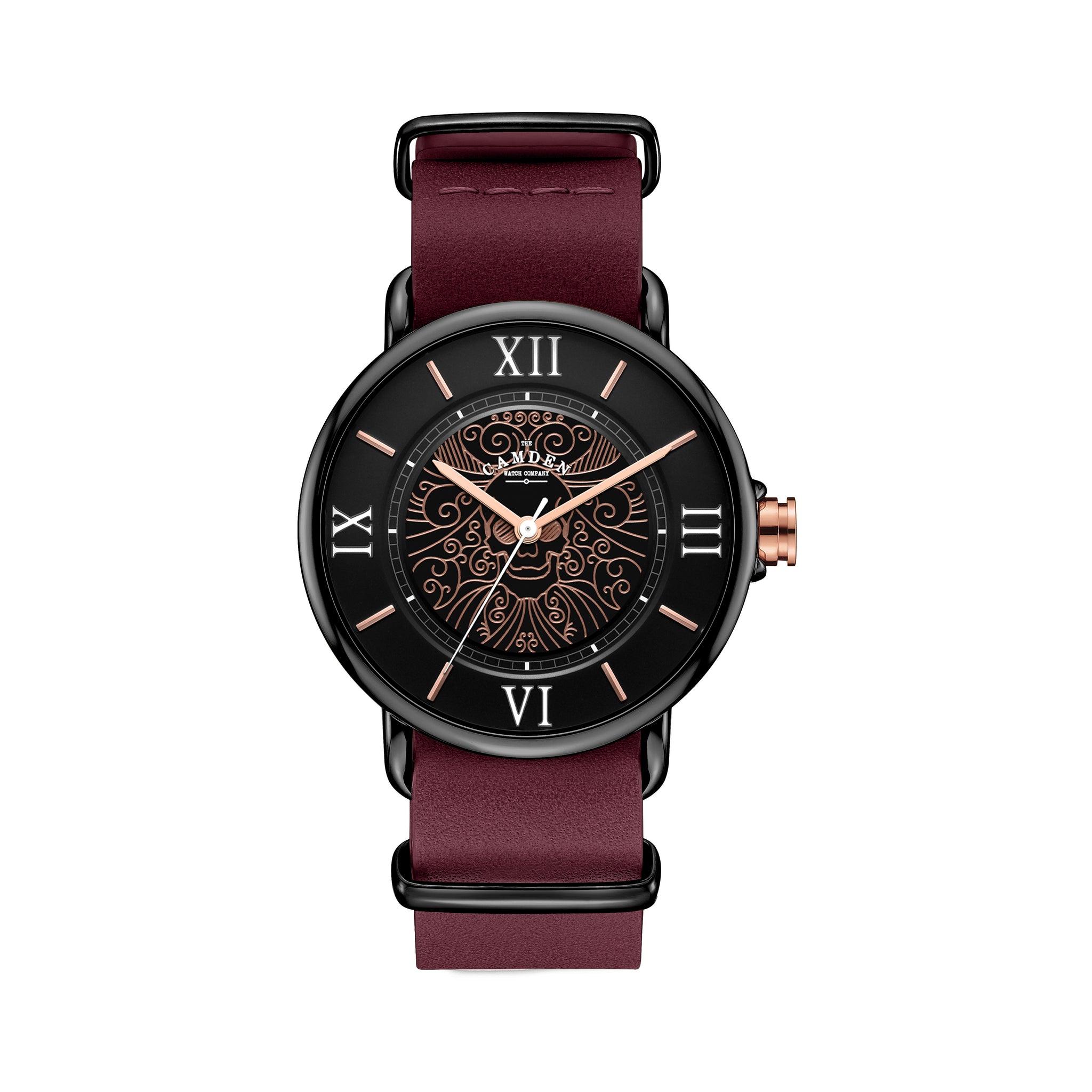 No.88 MEMENTO MORI BLACK AND ROSE GOLD WATCH WITH OXBLOOD LEATHER STRAP.