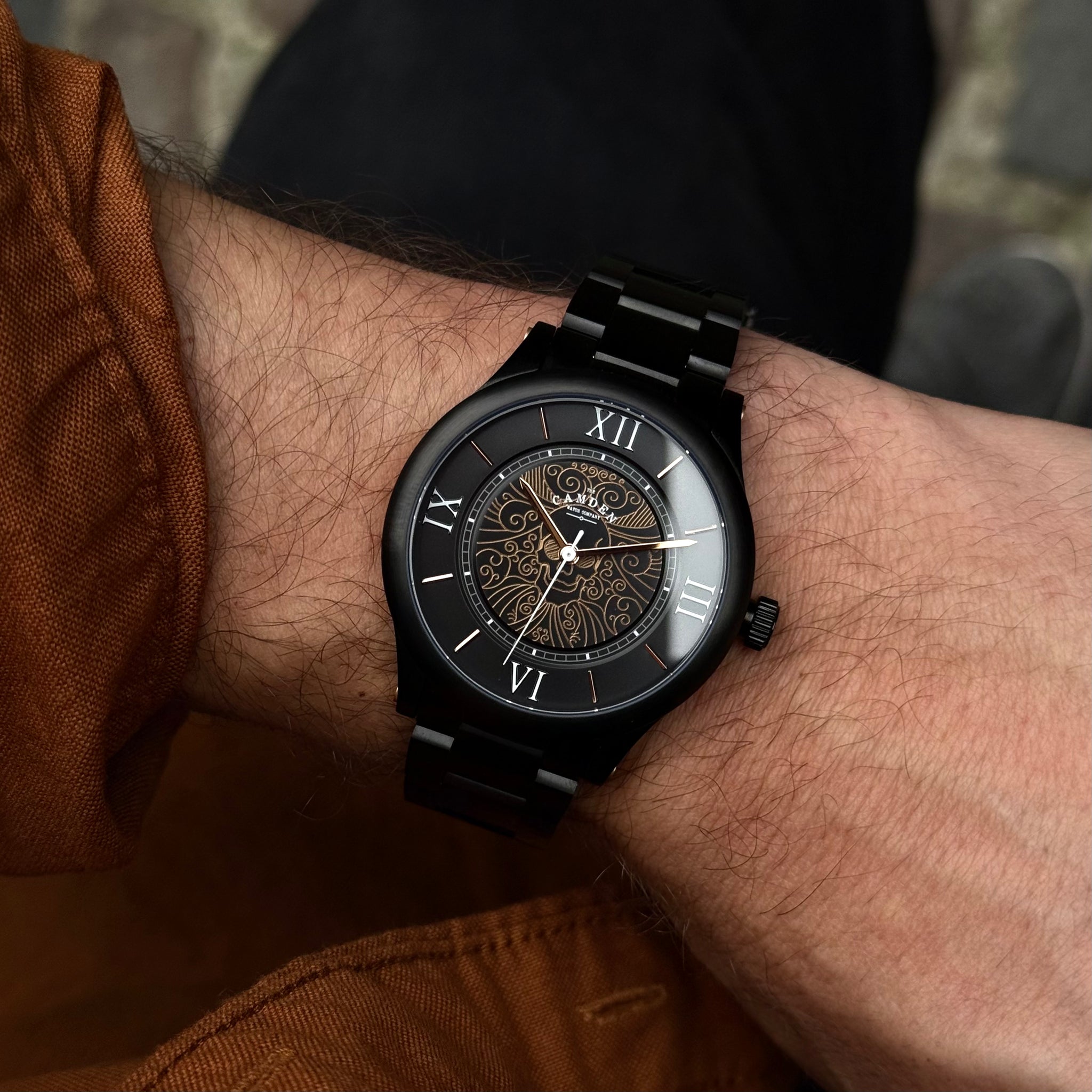The Northern Edition is a small batch range of limited edition Camden Watch Company timepieces, only produced in a small quantity each year. Each yearly batch features the year of production on the dial. The Northern Editon is a black case, yellow gold detailing and light purple accents.