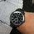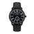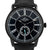 BLACK CASE WITH BLACK DIAL AND BLACK LEATHER STRAP.