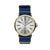 • GOLD CASE WITH SILVER DIAL AND NAVY BLUE LEATHER STRAP.