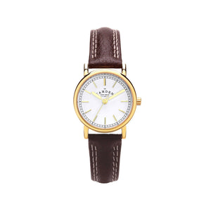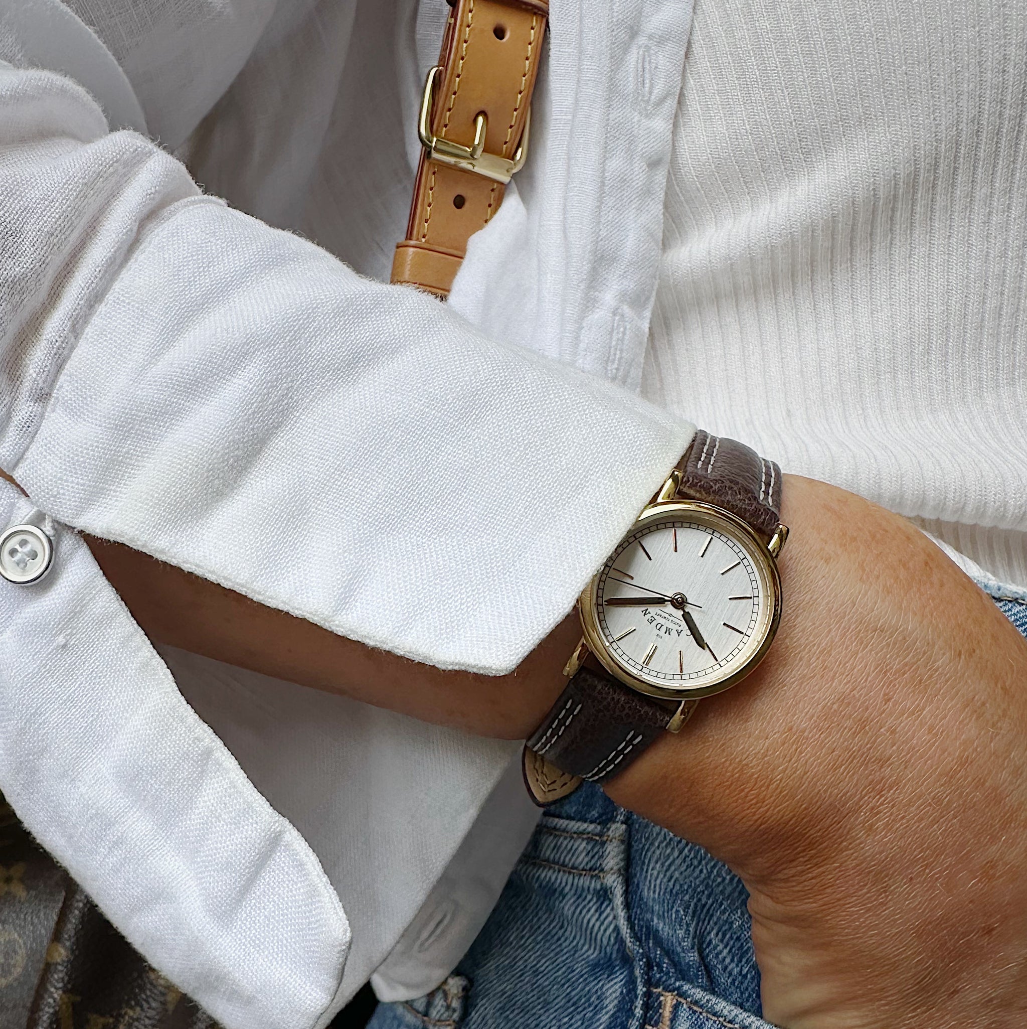 • GOLD CASE WITH SILVER DIAL AND BROWN LEATHER STRAP.