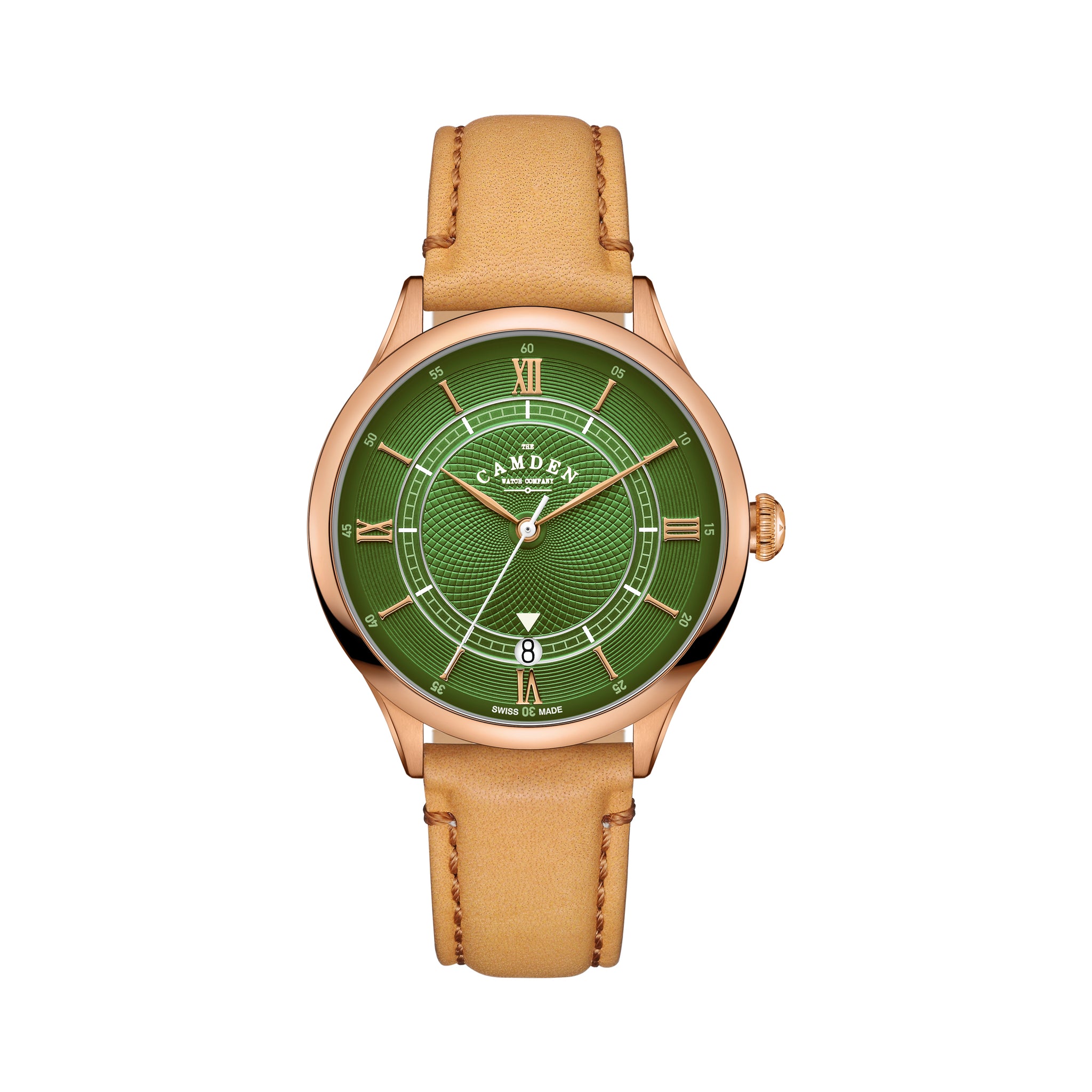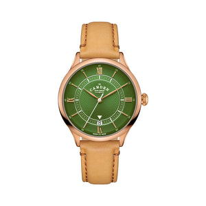 • ROSE GOLD CASE WITH GREEN DIAL AND TAN LEATHER STRAP.