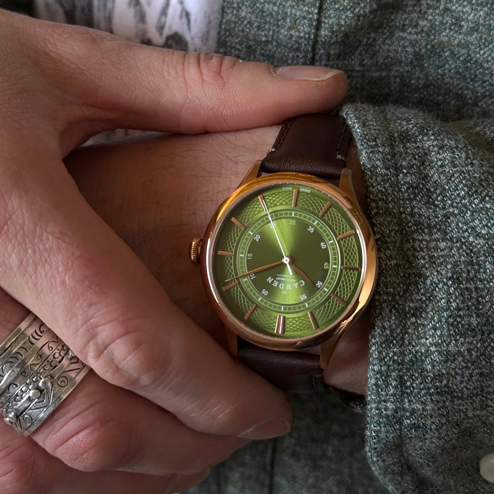 ROSE GOLD CASE WITH GREEN DIAL AND BROWN LEATHER STRAP.