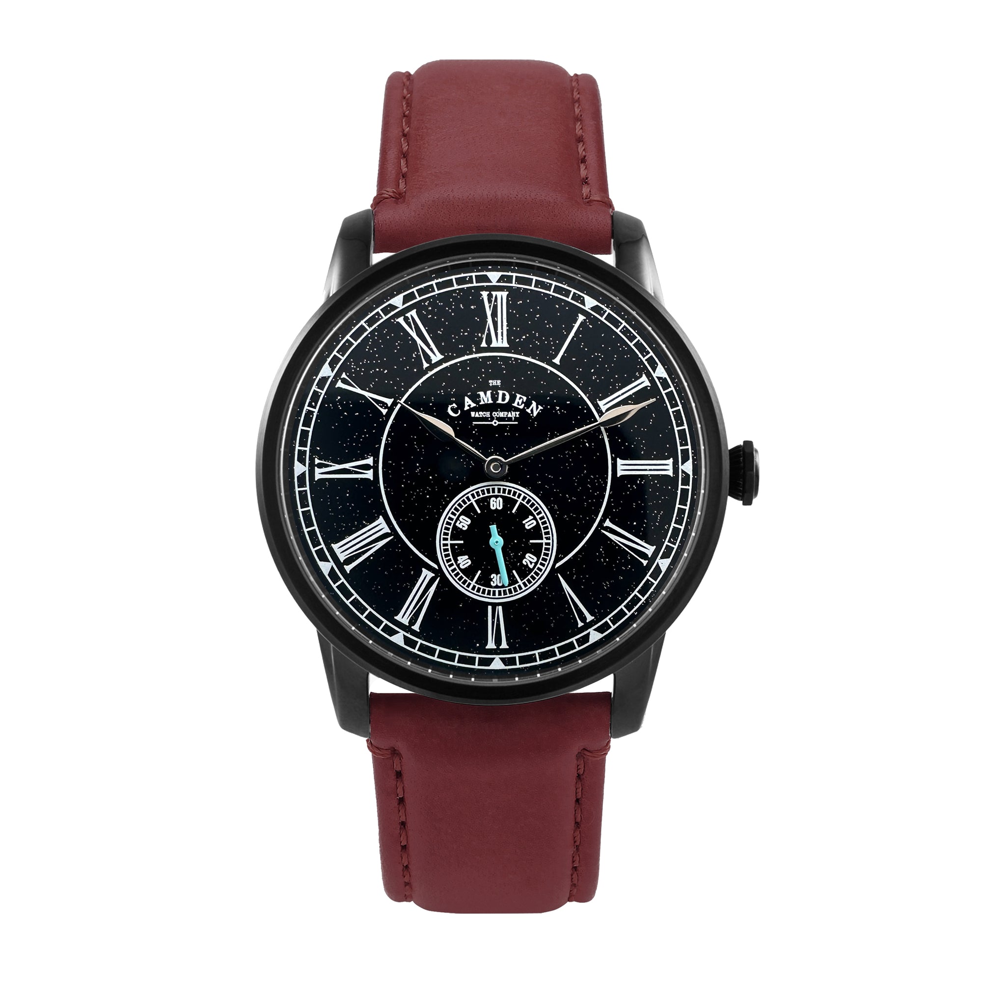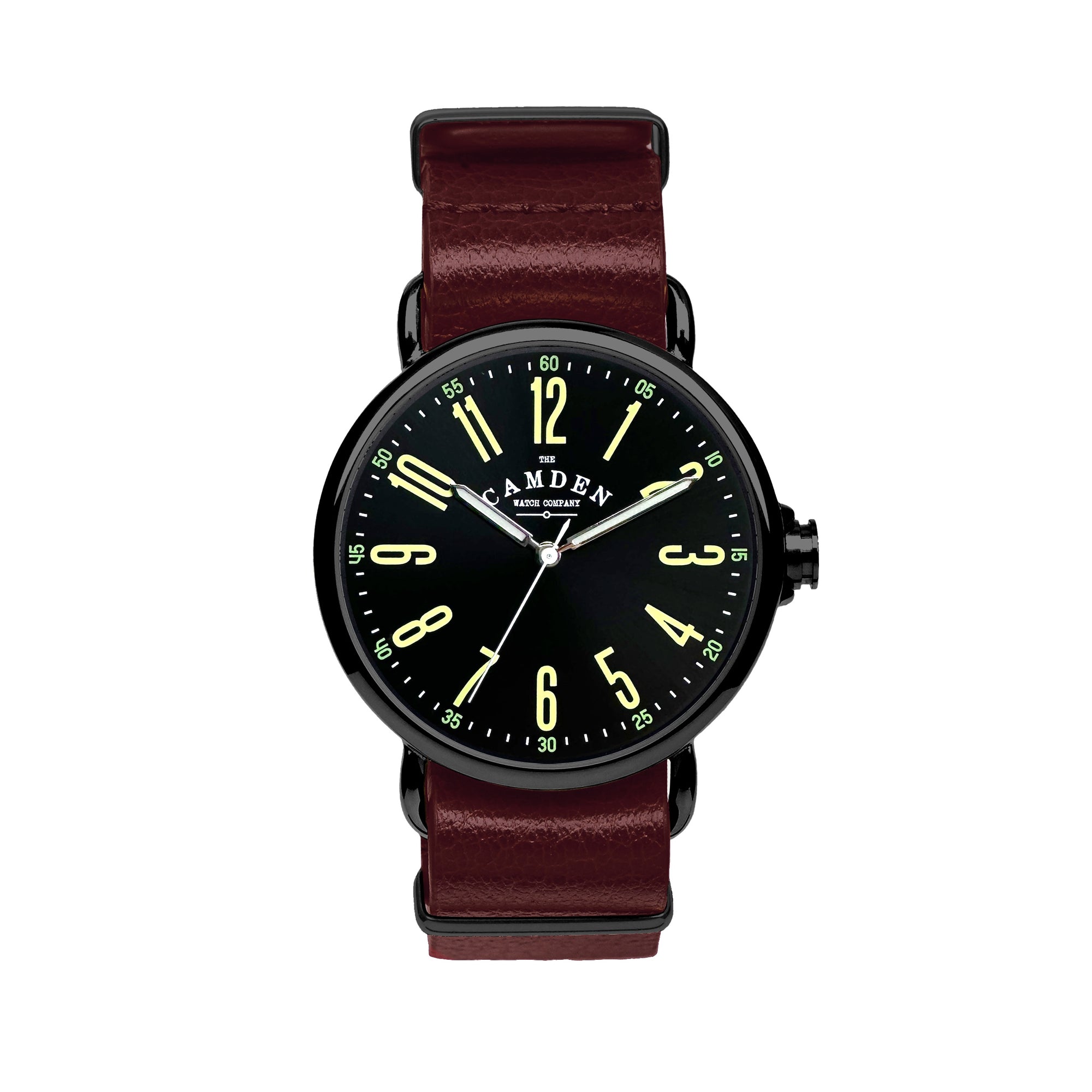 BLACK CASE AND OXBLOOD LEATHER STRAP.