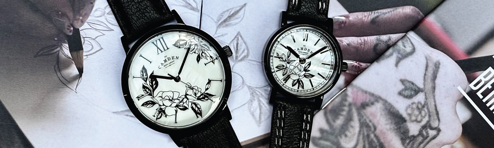 A No.24 Camden Watch designed in collaboration with tattoo artist Rebecca Vincent. Inspired by the Victorian Language of Flowers, Rebecca has brought her signature style to the white Mother of Pearl dial, making this monochrome watch a beautiful and striking addition to any wrist.