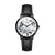BLACK CASE WITH WHITE MOTHER OF PEARL DIAL AND BLACK LEATHER STRAP.