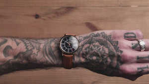 ROSE GOLD CASE WITH BLACK DIAL AND TAN LEATHER STRAP.