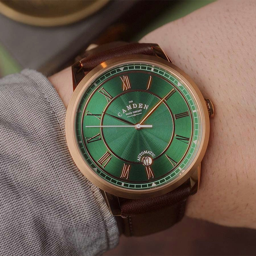 ROSE GOLD CASE WITH GREEN DIAL AND BROWN ITALIAN LEATHER STRAP.