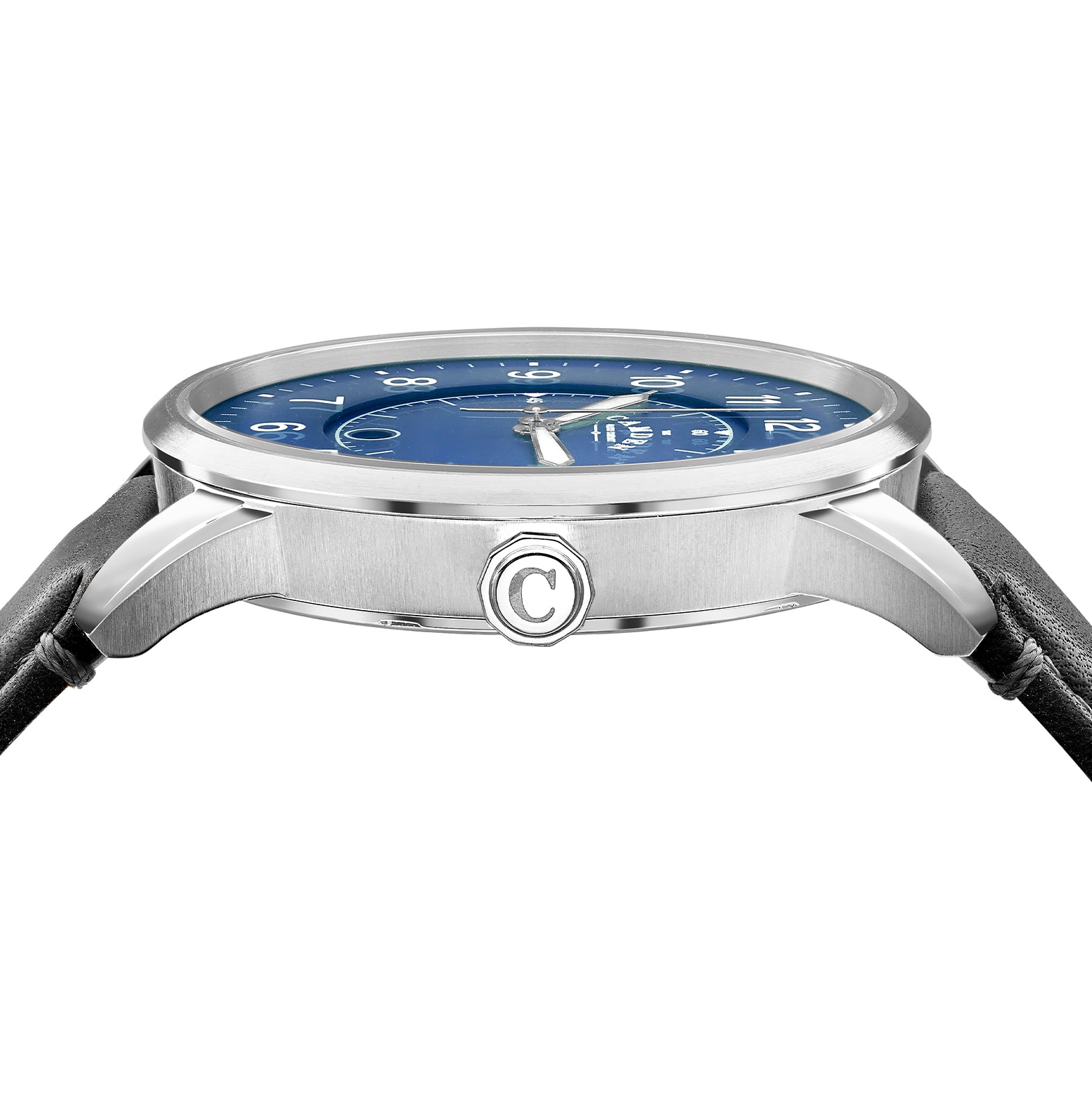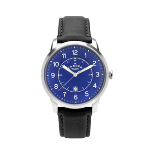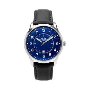 STEEL CASE WITH NAVY DIAL AND BLACK LEATHER STRAP.