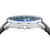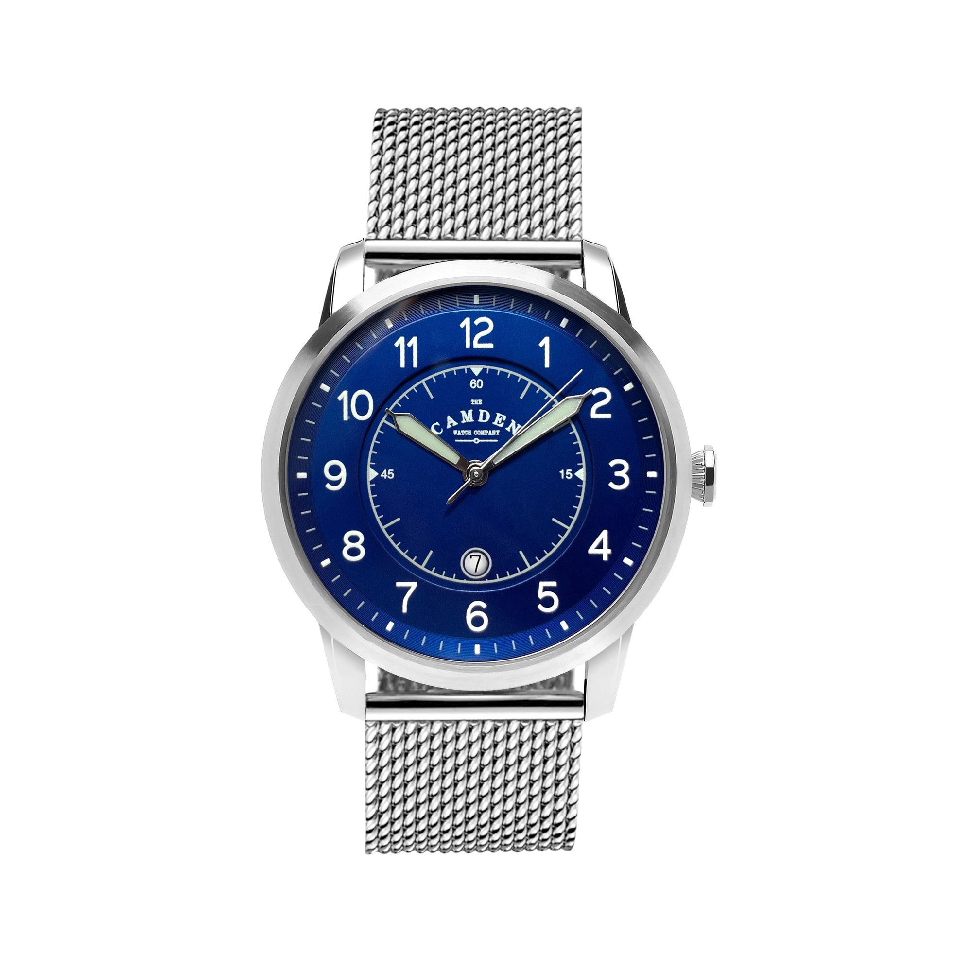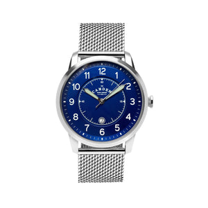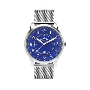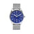 STEEL CASE WITH NAVY BLUE DIAL AND STAINLESS STEEL MESH BAND.