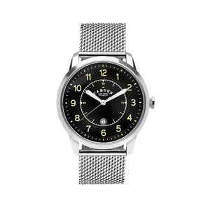 STEEL CASE WITH BLACK DIAL AND STAINLESS STEEL MESH BAND.