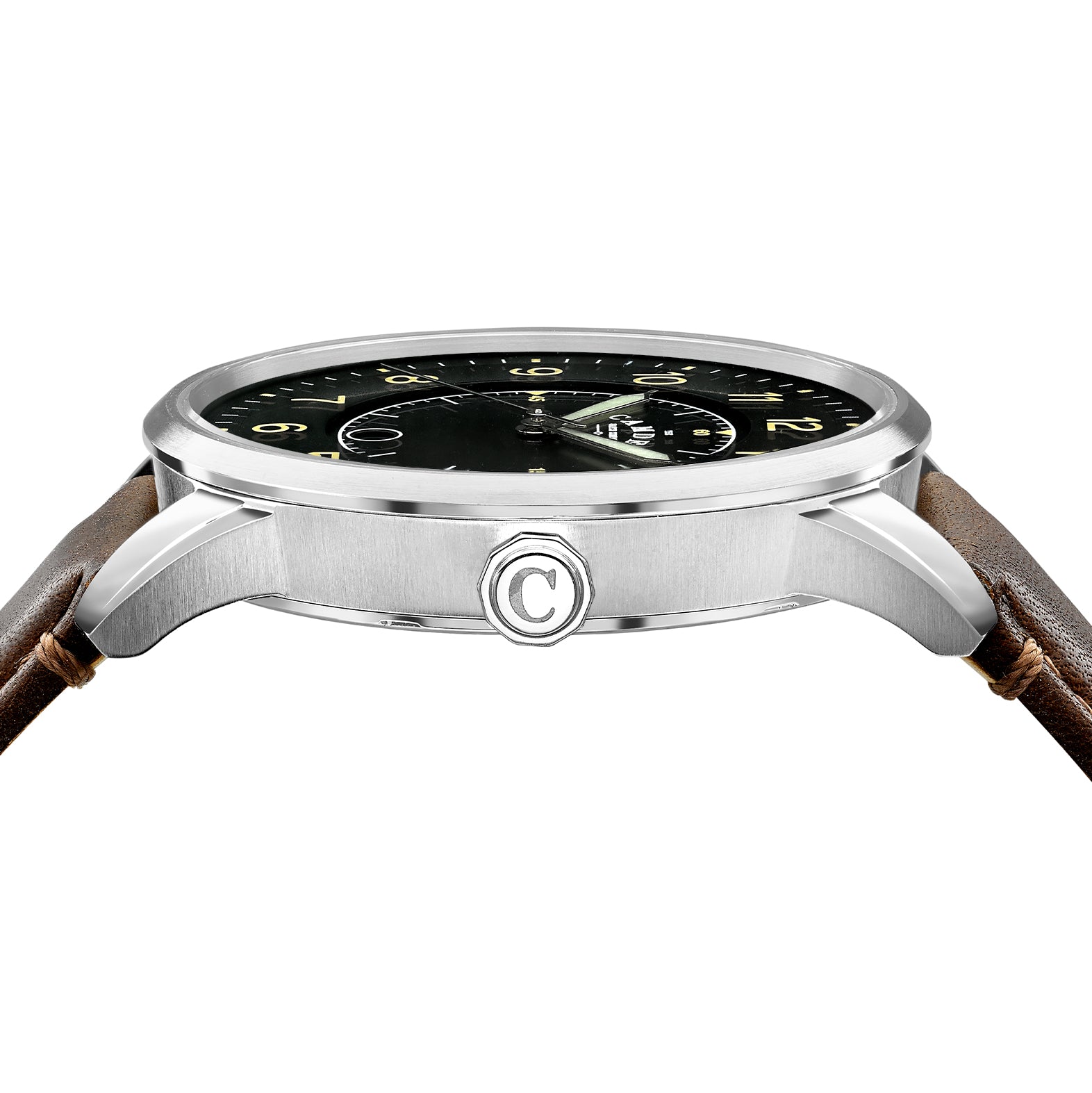 A pilot-inspired watch dial with large, luminous numbers, a Swiss movement, sapphire crystal, and Italian leather strap.