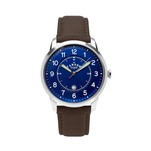 STEEL CASE WITH NAVY DIAL AND BROWN LEATHER STRAP.