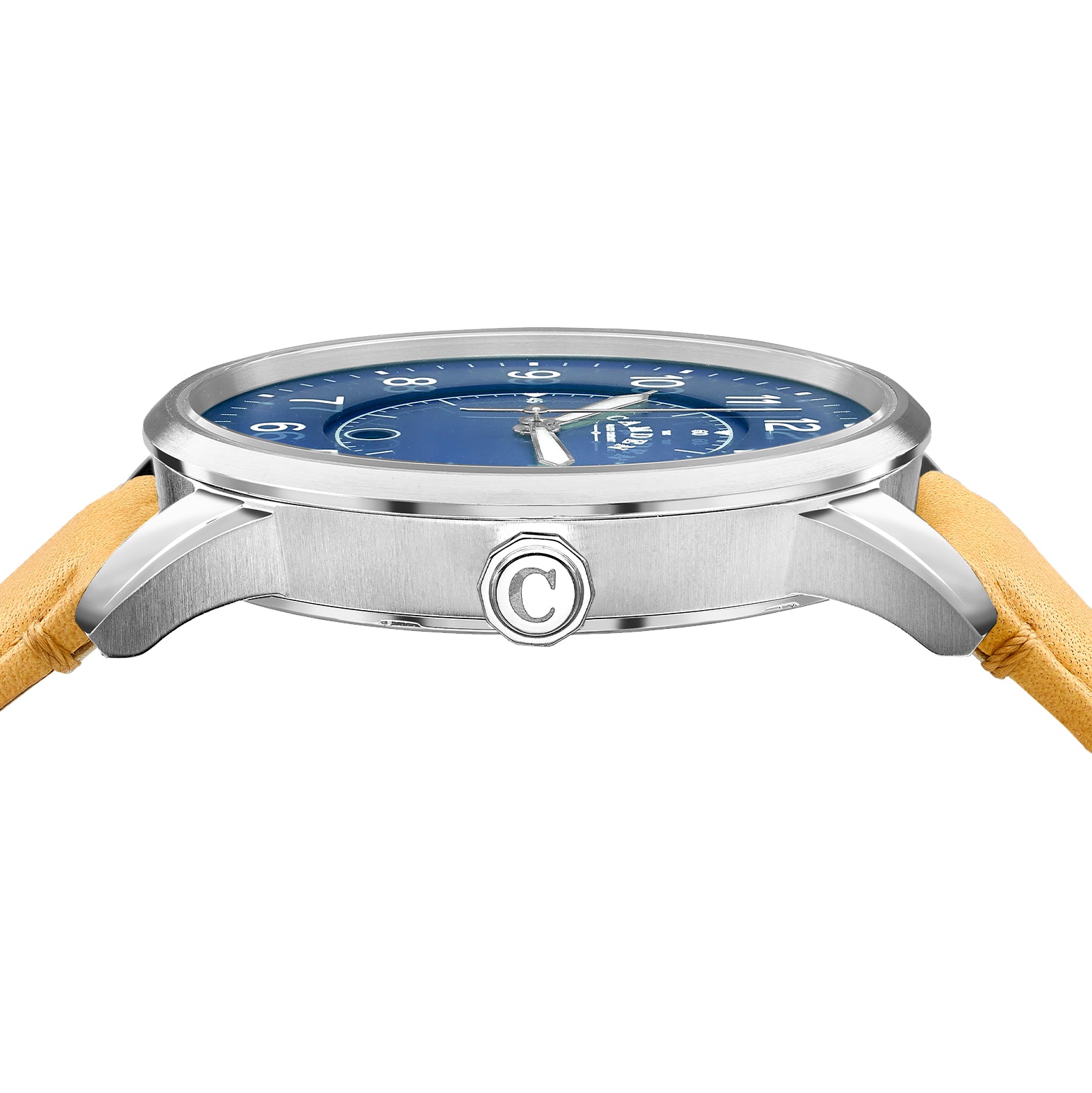 STEEL CASE WITH NAVY DIAL AND NAVY LEATHER STRAP.