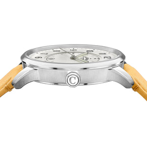 STEEL CASE WITH WHITE DIAL AND TAN LEATHER STRAP.