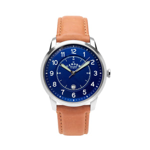 STEEL CASE WITH NAVY DIAL AND TAN LEATHER STRAP.