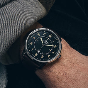 The No.29 Type II is inspired by vintage pilot watches and reworked for the modern wrist. Large, contrasting and highly legible numbers punctuate the two-layer dial that sits within the tapered contemporary case.