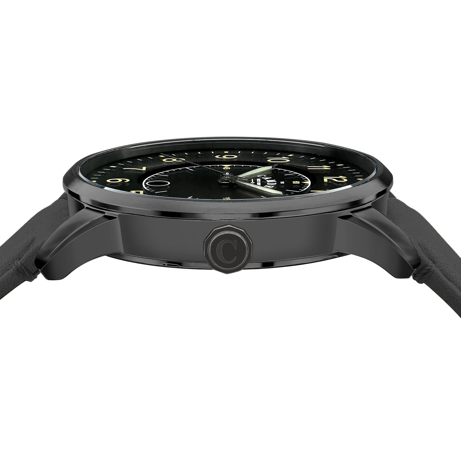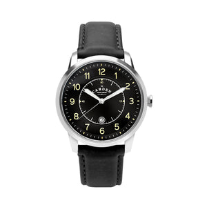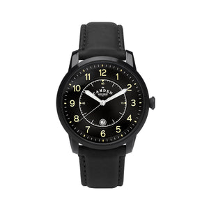 BLACK CASE WITH BLACK DIAL AND BLACK LEATHER STRAP.