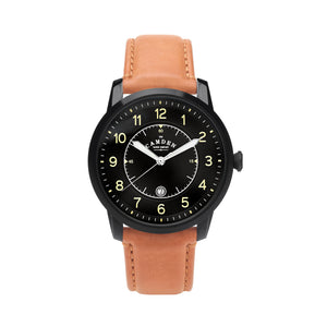 STEEL CASE WITH BLACK DIAL AND TAN LEATHER STRAP.