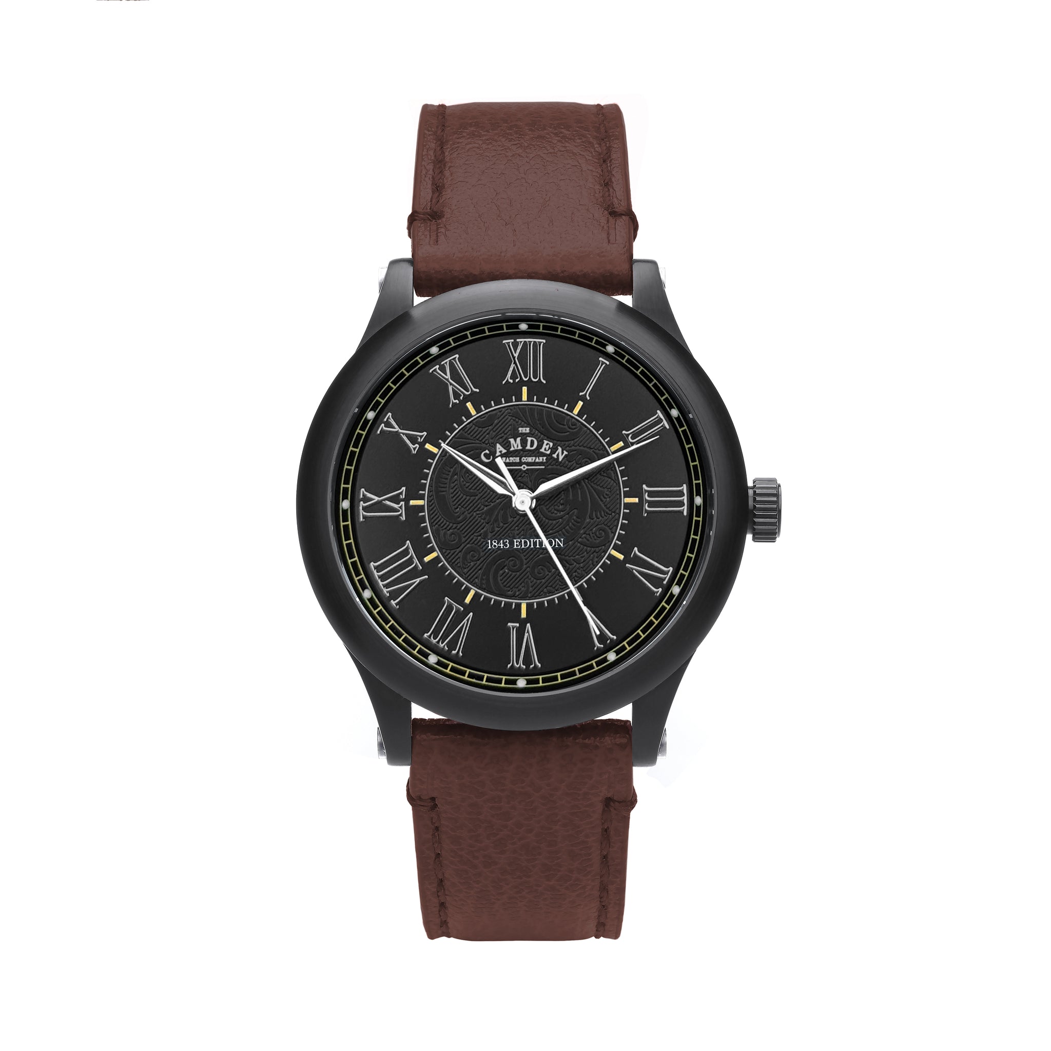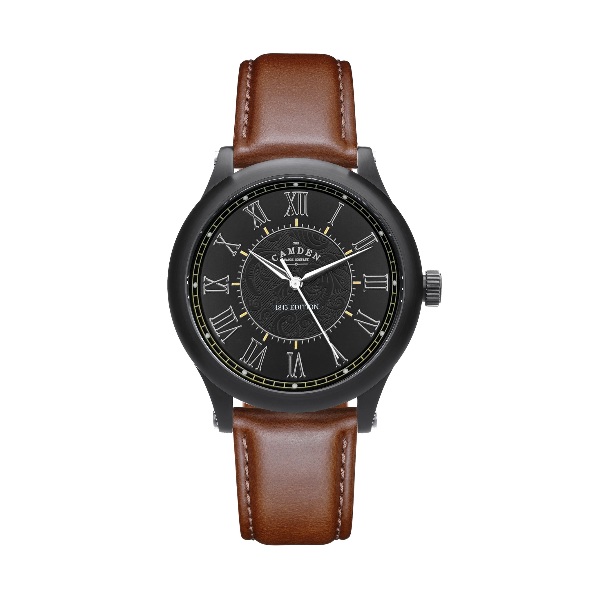 1843 BLACK WATCH AND BROWN LEATHER STRAP.