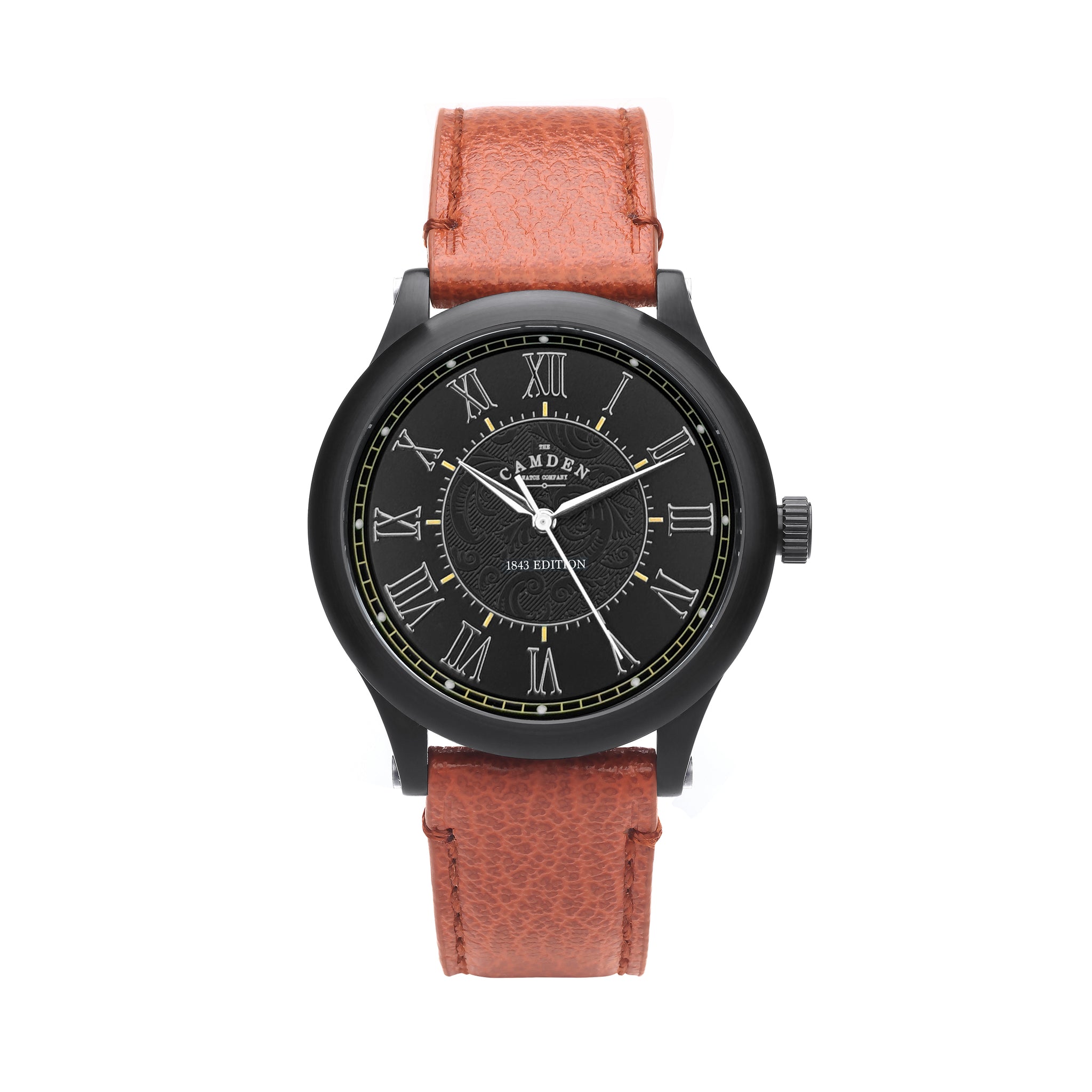 1843 BLACK WATCH AND TAN LEATHER STRAP.