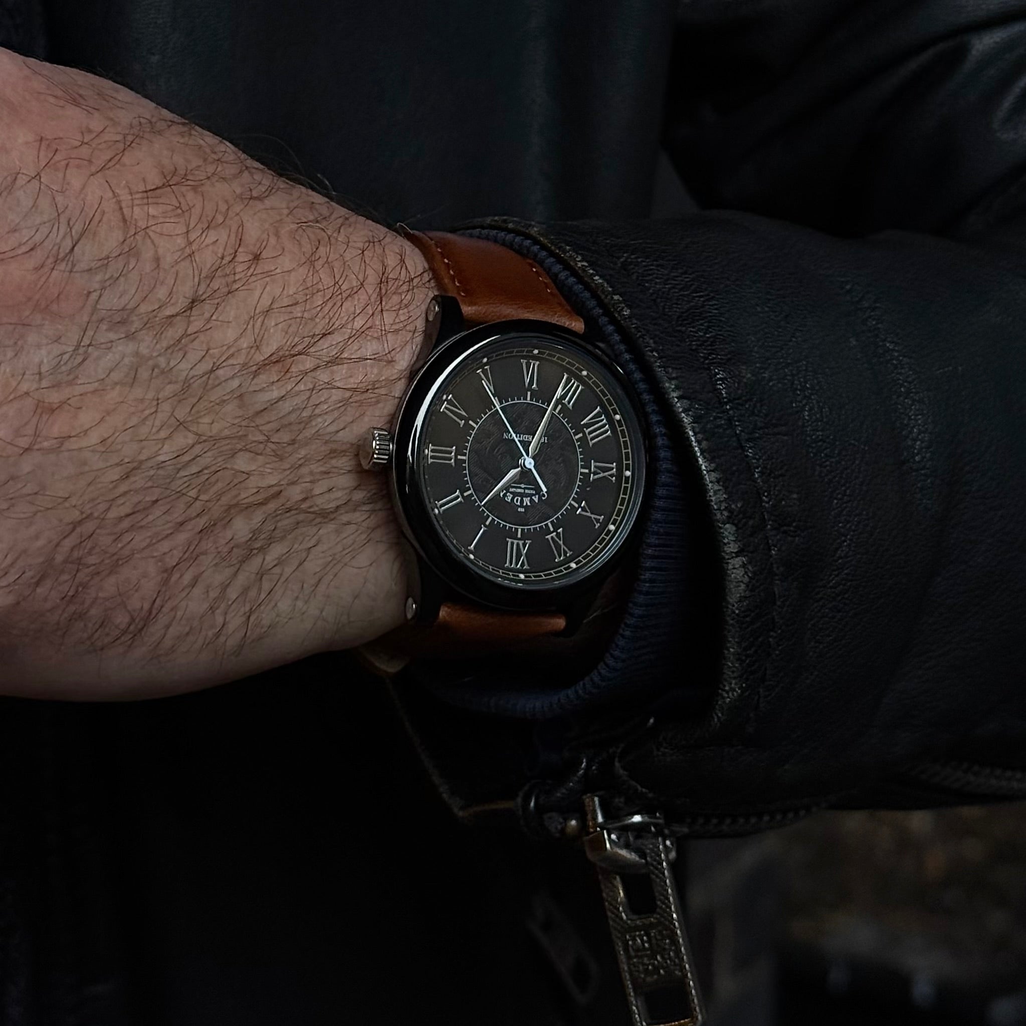 No.27 MEMENTO MORI BLACK WATCH AND TAN LEATHER STRAP.