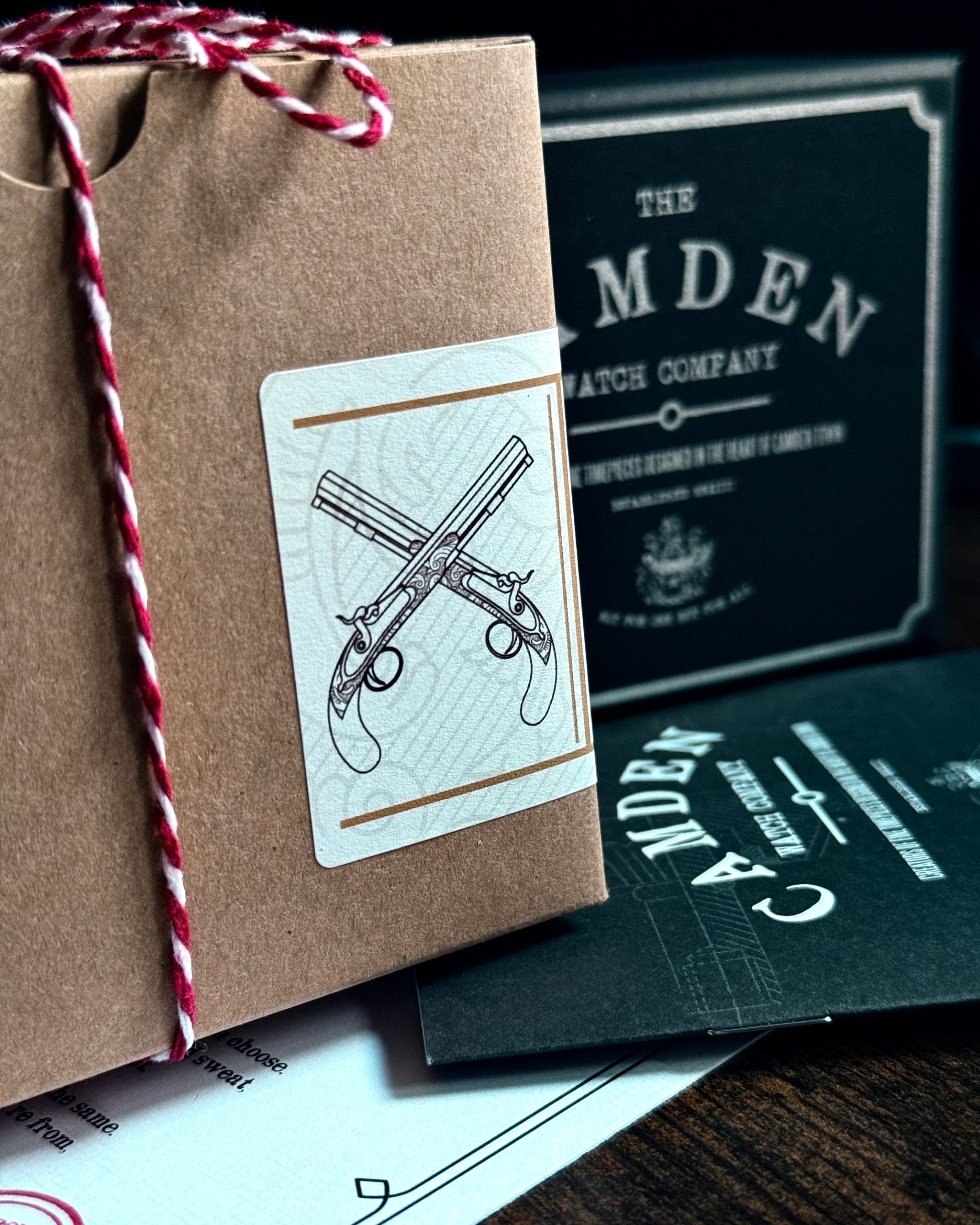The watch itself draws from the colour and character of duelling pistols, with both the case and dial carrying an intricate paisley motif inspired by the elegant engravings found on historic pistols — a subtle nod to a dramatic chapter of Camden’s past.