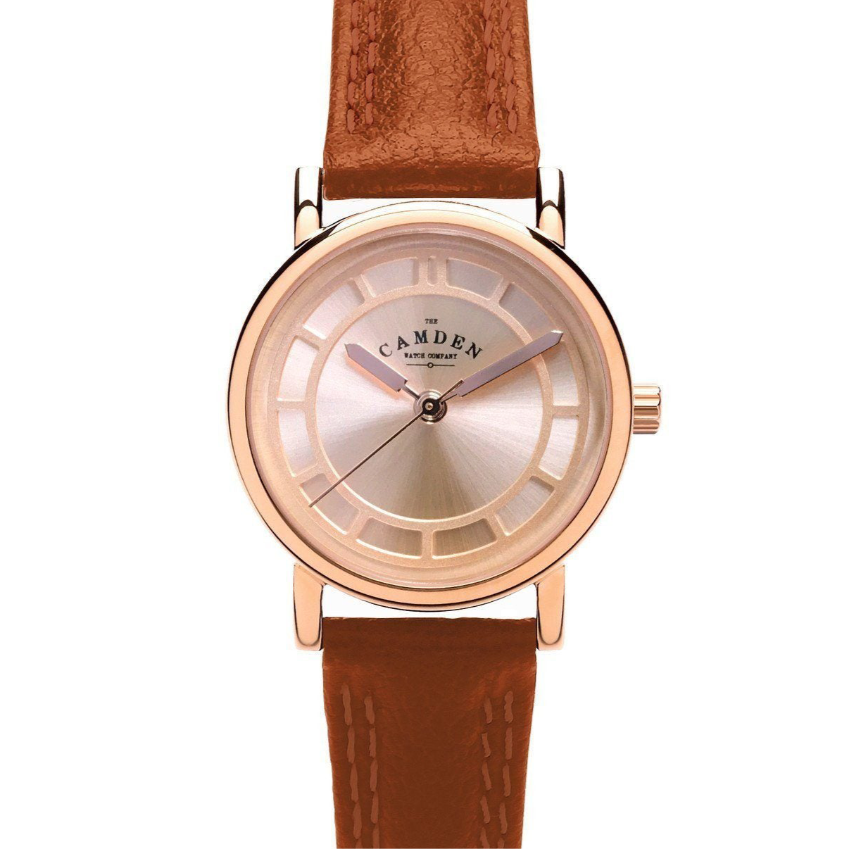 ROSE CASE WITH ROSE GOLD DIAL AND TAN LEATHER STRAP.