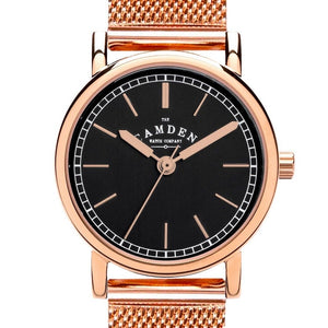 ROSE GOLD CASE WITH BLACK DIAL AND MESH BRACELET.